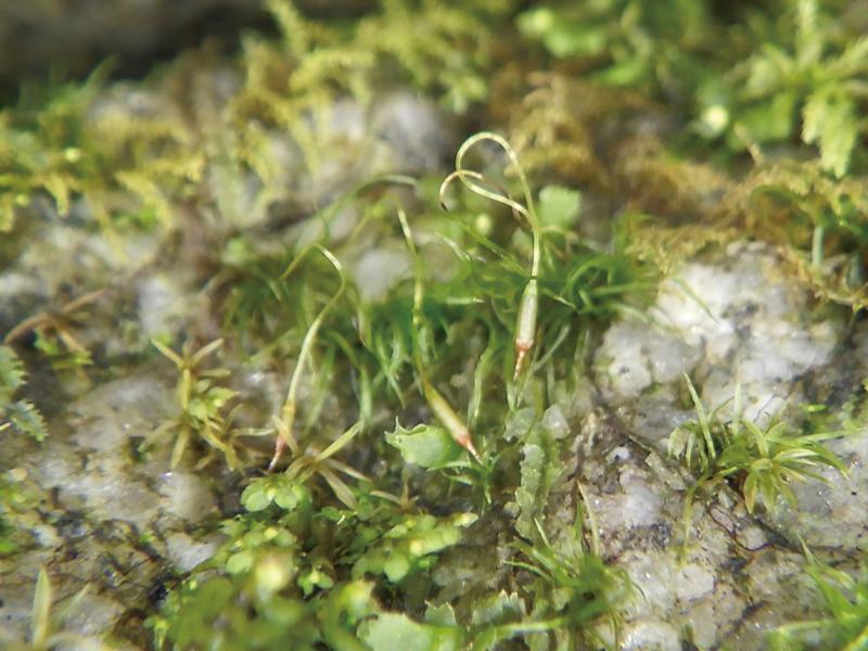 | 種の概要 | 山地の林内の半日陰で比較的多湿地の岩上に生育する。茎は高さ1~2mmの微小であり,蒴柄は繊細で長く白鳥の首のように湾曲する。 |