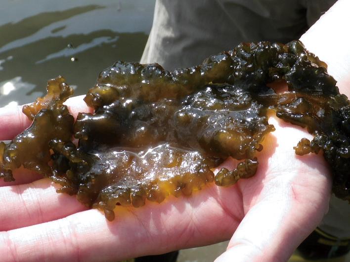 | 種の概要 | 群体は比較的堅く,外形様々,表面に凹凸多く,群体の厚さ600~1000μmの扁平な広がりを持ち,長さ数cmに達する。暗緑色。細胞は楕円形,幅3.5~4μm,長さ6~7μm,群体基質中に不規則に散在するが,群体基質の表層に近いほど密である。湧泉の池底に沈生。 |