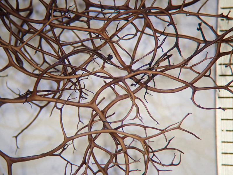 | 選定理由 | 大内(1970)は英彦山と釈迦岳で本種の報告をしたが,Kashiwadani et al.(1998)では英彦山で確認できなかったとしている。釈迦岳が本種の国内南限でもあり,絶滅危惧IA類に選定した。今回,大内標本を確認したが,1970年代は大量に存在していたことがうかがわれる。枝からぶら下がる形態であり目立つが,今回の調査では釈迦岳,英彦山ともに確認できなかった。 |
