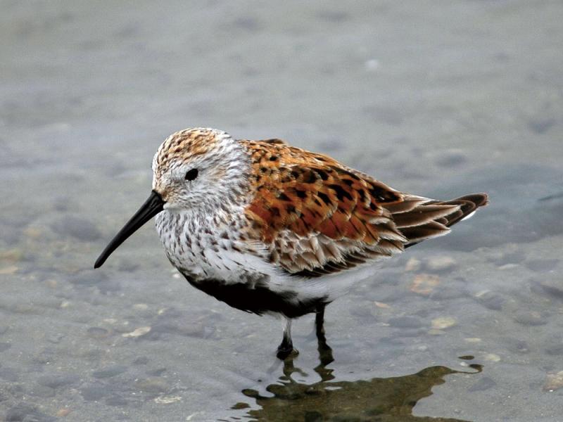 | 種の概要 | 全長約20cm。長く下にやや曲がった嘴を持つ小型のシギ類。繁殖羽では頭頂,背部は赤褐色地の黒色の斑,胸は白色地に黒褐色の縦斑があり,腹部に大きな黒色斑がある。非繁殖羽は頭頂部から背面が灰褐色,喉から腹部にかけて白色。ユーラシア,北アメリカの極北沿岸で繁殖し,ヨーロッパ,アフリカ北部,中東,中国の沿岸,北アメリカ東・西沿岸で越冬する。国内では,渡り期に干潟を中心とした各地の湿地で観察され,越冬期には優占する(環境省,2014)。 |