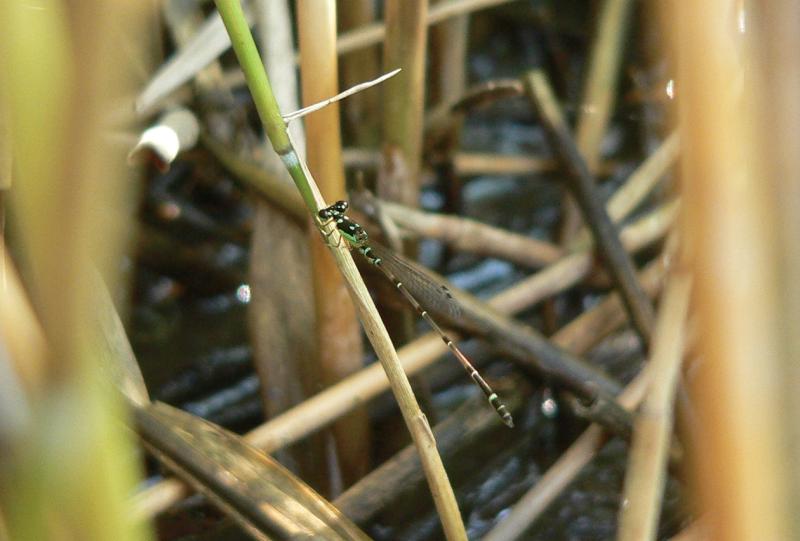 | 種の概要 | 県内では北九州市で記録されているのみ。生息地の詳細については,現在も非公表としている。海岸沿いのヨシなどが密生する汽水域の湿地にのみ生息する。県内の生息環境は潮止め堤防内の沼沢地である。成虫は密生したヨシ原からほとんど外に出ない。水面に浮かぶ枯死植物などに産卵し,幼虫は水中の枯れたヨシなどの堆積物につかまって生活している。北九州市の産地では緑色型雌(雄型雌)もみられる。 |