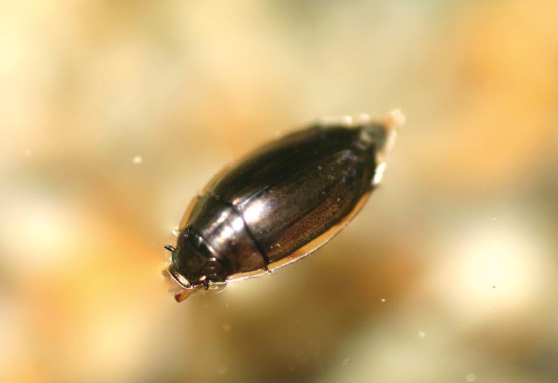 | 種の概要 | 体長約10mm。背面は黒褐色で金属光沢がある。体側部は黄褐色に細く縁どられる。上翅端部は棘状になる。植物が豊富な池沼や水路に生息し,水質が良好な環境を好む。繁殖期は5~8月で,水中の植物表面に産卵する。幼虫は小動物を捕食して成長し,陸上で土繭をつくりその中で蛹となる。新成虫は初夏から秋に出現する。成虫は水面で生活し,水面上に落ちた小昆虫などを捕食する。2010年代以降は全国的に激減している。 |