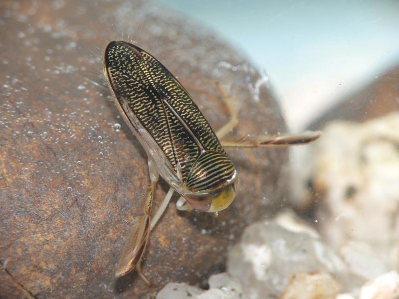 | 種の概要 | 体長約10mm。背面は黄褐色で,前胸背に8~9本の黒色横帯,上翅に細かい黒色斑紋がある。複眼は赤褐色。水生植物が豊富な止水域に生息し,水質が良好な環境に多い。早春に水中の植物表面に産卵し,新成虫は初夏に出現する。越冬は水中で行う。雑食性で藻類や小動物を食べる。オオミズムシに似ており,正確な同定には雄前脚跗節の特徴などをみる必要がある。 |