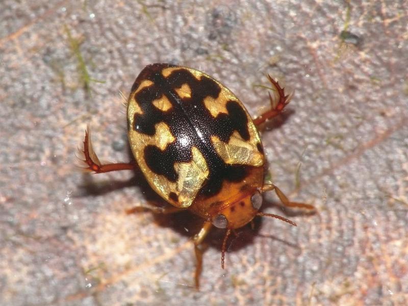 | 種の概要 | 体長4.0~5.0mm。頭部と前胸背は橙黄褐色。上翅は黄褐色地で複雑な黒褐色模様に覆われる。止水域に生息し,水田など明るく開けた湿地から,植生豊富なため池,林内の薄暗い湿地など様々な環境でみられる。繁殖期は春で,夏に新成虫が出現する。成虫で越冬する。幼虫はカイミジンコ類を好むことが知られる。 |