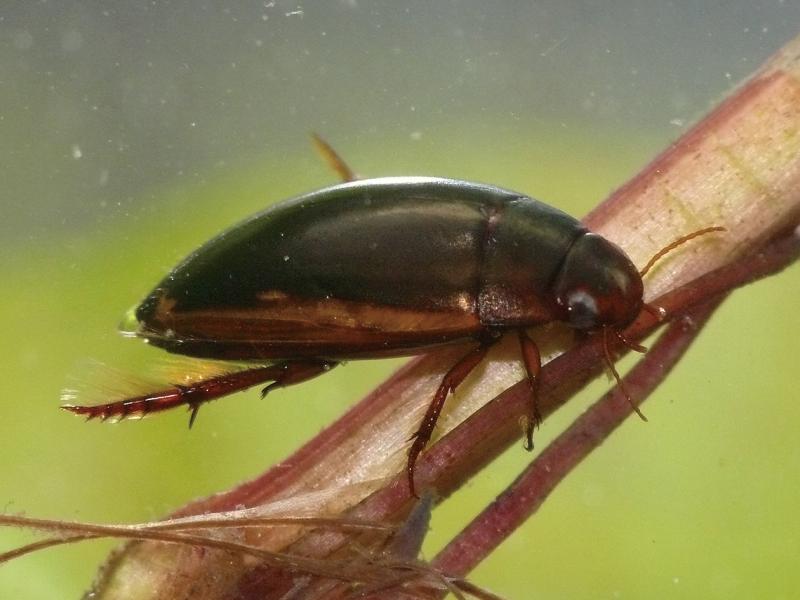 | 種の概要 | 体長約9.0mm。背面は黒色で,上翅の側縁は細く黄褐色で縁取られる。植物が豊富な比較的大きな池沼に生息し,岸際の植生帯の中や薄暗い落葉の堆積した環境を好む。生活史の詳細は不明だが,幼虫は冬季から早春に確認されている。 |