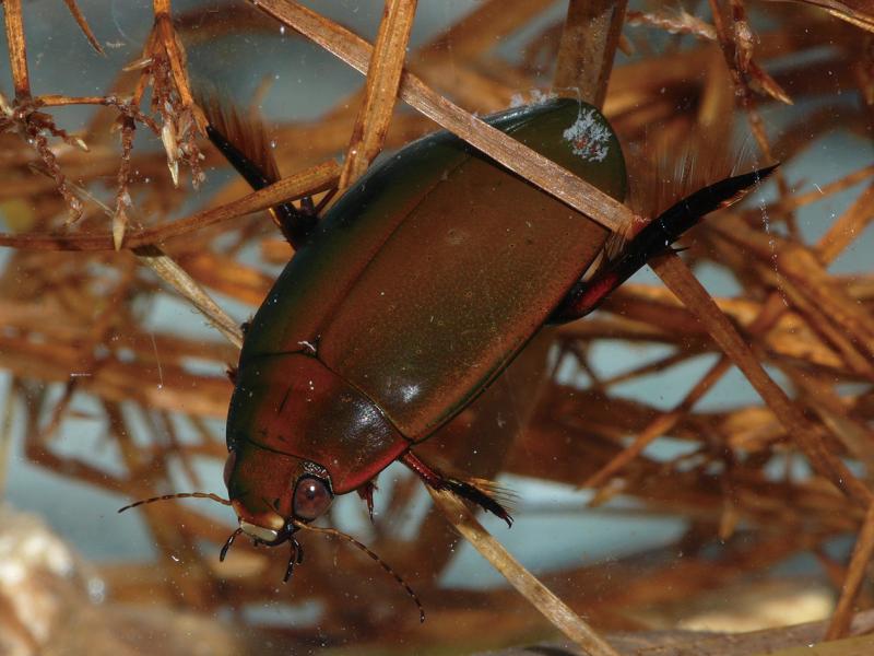 | 種の概要 | 体長約23mm。背面は緑色を帯びた黒褐色。水生植物が豊富な止水域に生息し,県内では水質が良好な山間のやや低水温の環境でみられる。繁殖期は5月頃で,水中の植物の茎中に産卵する。幼虫は5~8月にみられ,新成虫は8月以降に出現する。成虫で越冬する。幼虫は生きた小動物を,成虫は主に死んだ小動物を食べる。 |