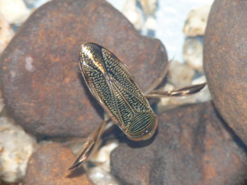 | 種の概要 | 体長10~13mm。背面は黄褐色で,前胸背に10~11本の黒色横帯,上翅に細かい黒色斑紋がある。複眼は赤褐色。植物が豊富な止水域に生息し,水質が良好な環境を好む。生活史の詳細は不明だが,県内では早春と盛夏の2回産卵する様子が観察されている。成虫で越冬する。日本産ミズムシ科の最大種。 |