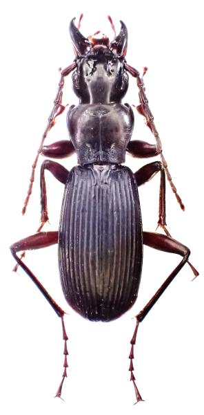 | 種の概要 | 体長24mm前後,全体黒色,大型のナガゴミムシで,頭部は大きく,前胸背は心臓形で後角は角張る,上翅は細長く,雄は光沢があるが,雌はつや消しになる。大あごや足は長い。九州産のナガゴミムシの中では,頭部が大きいことが特徴的である。主としてブナ帯林床の湿ったガレ場などで地下浅層からみつかり,大岩の下に潜んでいることもある。英彦山から白髪岳まで連なる九州中央脊梁沿いの地域に分布する。 |