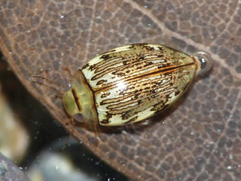 | 種の概要 | 体長3.9~4.7mm。背面は淡黄褐色で,上翅には独特の複雑な黒褐色模様がある。植物が豊富な止水域に生息し,水質が良好な環境を好む。県内では6月頃に幼虫がみられ,新成虫は初夏に出現する。成虫は冬季に水中でもみられるが,主に陸上で越冬するものと思われる。 |