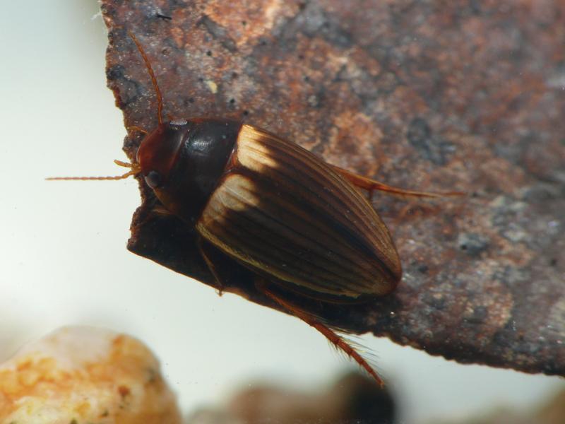 | 種の概要 | 体長4.8~5.5mm。背面は黒褐色~茶褐色で,上翅基部は黄褐色。上翅には6条の明瞭な縦溝がある。雄交尾器中央片は上方にトサカ状突起がある。干上がりやすい浅い湿地環境に生息し,樹林内やヨシ原内など薄暗い環境を好む。生活史の詳細は不明。 |