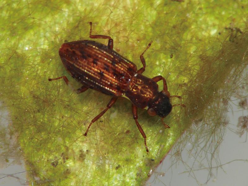 | 種の概要 | 体長約2.5mm。背面は暗褐色~茶褐色で,青緑色の金属光沢がある。上翅の奇数間質の隆起は明瞭。止水域に生息し,平地~丘陵地の水質が良好な環境を好む。特に岸際の薄暗く水が染み出しているような環境でみられる。生活史の詳細は不明だが,幼虫・成虫ともに植食性。 |