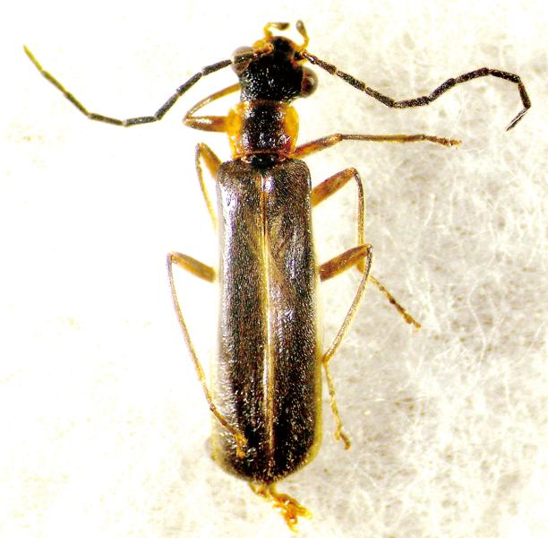 | 種の概要 | 体長9.7~12.7mm,体は黄褐色で,頭部,前胸背中央部,触角(基部を除く)は黒色。周辺を除く上翅は薄い黒褐色。主として発達した常緑広葉樹林からブナ帯に生息し,花上・葉上で小昆虫を捕食する。本州(長野県から山口県)と九州では英彦山地に限って分布する。 |
