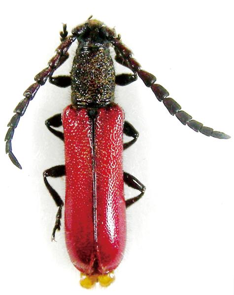 | 種の概要 | 体長15~18mm,体は濃赤朱色,頭胸部,腹部,触角,足は黒味を帯びる。前胸背は大点刻を密布し横皺状。5~6月に暖帯林に出現し,アカメガシワ,クリ,リョウブの花に飛来する。幼虫のホストはクスノキ・タブ(生木)。本州から九州と周辺離島に分布し,国外では朝鮮,中国に分布する。 |