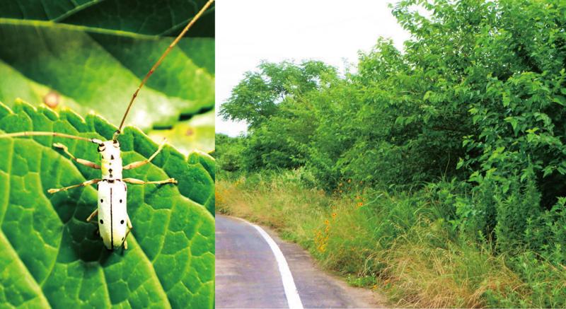 | 種の概要 | 体長11~17mm,背面は全体純白の微毛に被われており,上翅には基部,中央,翅端部にそれぞれ1対の黒紋を具える。触角は長く,雄で体長の2.7倍,雌で2.4倍の長さである。本種はクワをホストとし,成虫はクワ類の葉を後食する。養蚕が盛んで各地でクワが栽培されていた頃は四国を除く全国各地で記録されていた。しかし養蚕が廃れクワ畑が無くなった後は急速に減少しており,各県でレッドデータブックに掲載されている。県内ではクワ畑はあまり多くなかったようで,過去にも本種の記録は少ない。 |