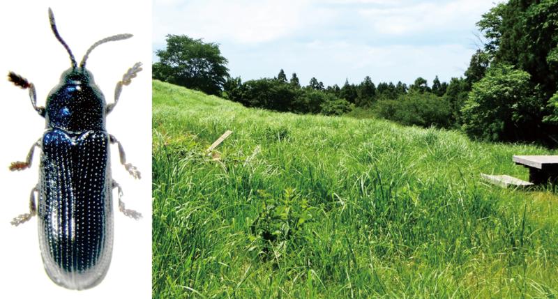 | 種の概要 | 体長4.2~5.3mm,黒色で細長く偏平なハムシ。上翅にはくっきりとした規則的な点刻列を具える。跗節は広がる。本種はトゲの無いトゲトゲ(ハムシ)の仲間ということで,トゲナシトゲトゲとも呼ばれた。本州,九州に分布し,草原のススキ・カヤの表面を線状に舐めるように食べる。 |