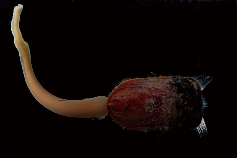 | 種の概要 | 殻長約70mm。長方形の暗褐色の殻から細長い赤茶色の軟体部(肉茎)が伸びる。殻の前縁部に1対の剛毛束を備える。低潮帯から潮下帯の砂泥底に生息し,殻を上に肉茎を下にした状態で底質中に潜って生活している。水深30mほどの場所からも採集されている。かつて記録のある瀬戸内海ではすでに絶滅し,国内では有明海のみに分布する。 |