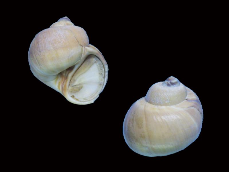 | 種の概要 | 殻長25mm,球形,臍盤は小さく,臍孔は小さいが明瞭に開く,蓋は石灰質白色で平滑,淡褐色の幅広い色帯を持つ。房総半島・能登半島から九州に分布。 |
