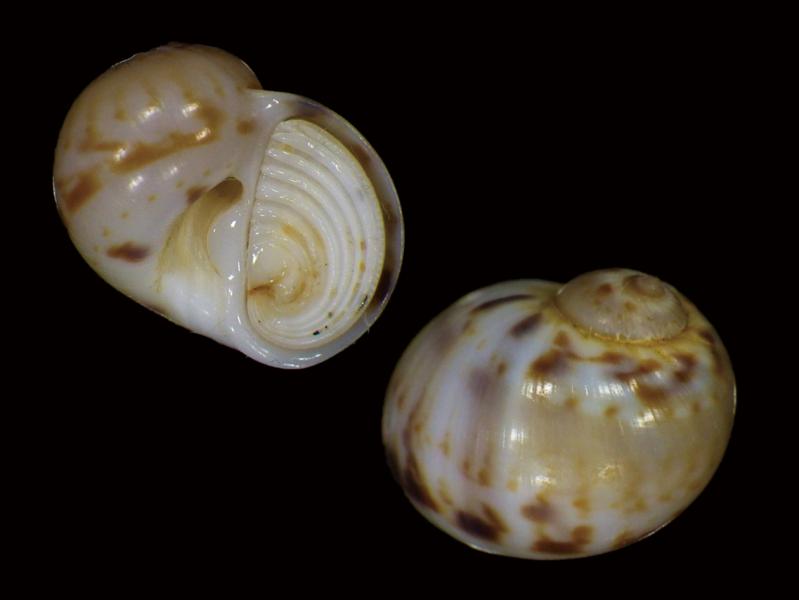 | 種の概要 | 殻長17mm,球形,厚質,殻の上半分は褐色の不明瞭な雲状斑で占められ,中央に太く不連続な褐色帯がある。房総・男鹿半島から九州,朝鮮半島に分布。内湾から外洋の低潮帯以深の砂底に生息する。 |