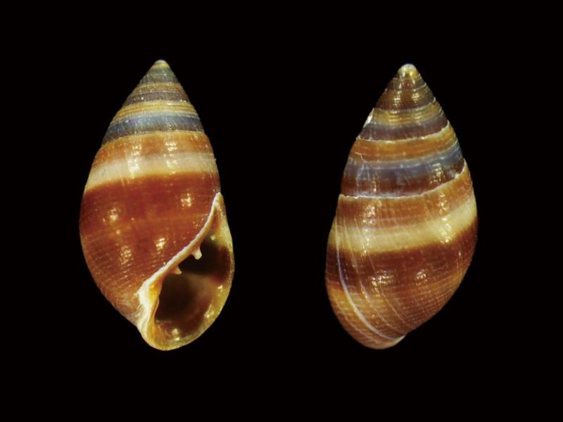| 種の概要 | 殻長5.5mm,紡錘形,青黒色・茶褐色で,白帯を備え,外唇は肥厚せず,内唇に2歯,軸唇に1歯がある。房総半島以南のインド・西太平洋に分布。 |