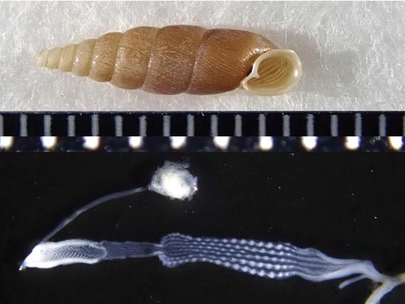 | 選定理由 | 本種は,県内では小呂島でのみ記録されていた(高橋・岡本,1969)。しかし,小呂島産とタイプ産地(長崎県五島市)のチイサギセルとの解剖比較を行ったところ,外部形態は似ているが,生殖器雄性部内襞形態がまったく異なっている事が分かった(右図下)。このため,本種の種名の表記をノミギセル属の一種(B)に改めた。解剖により別種である事が判明したが,生息地が限定的であるため,環境の変化で容易に絶滅するおそれがあると考えられ,絶滅危惧II類に評価した。 |